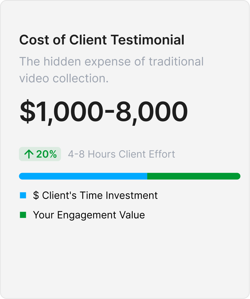 Traditional video testimonials are logistically impossible. DIY requests have <10% completion. Professional production costs $2,000-$15,000+ per video.